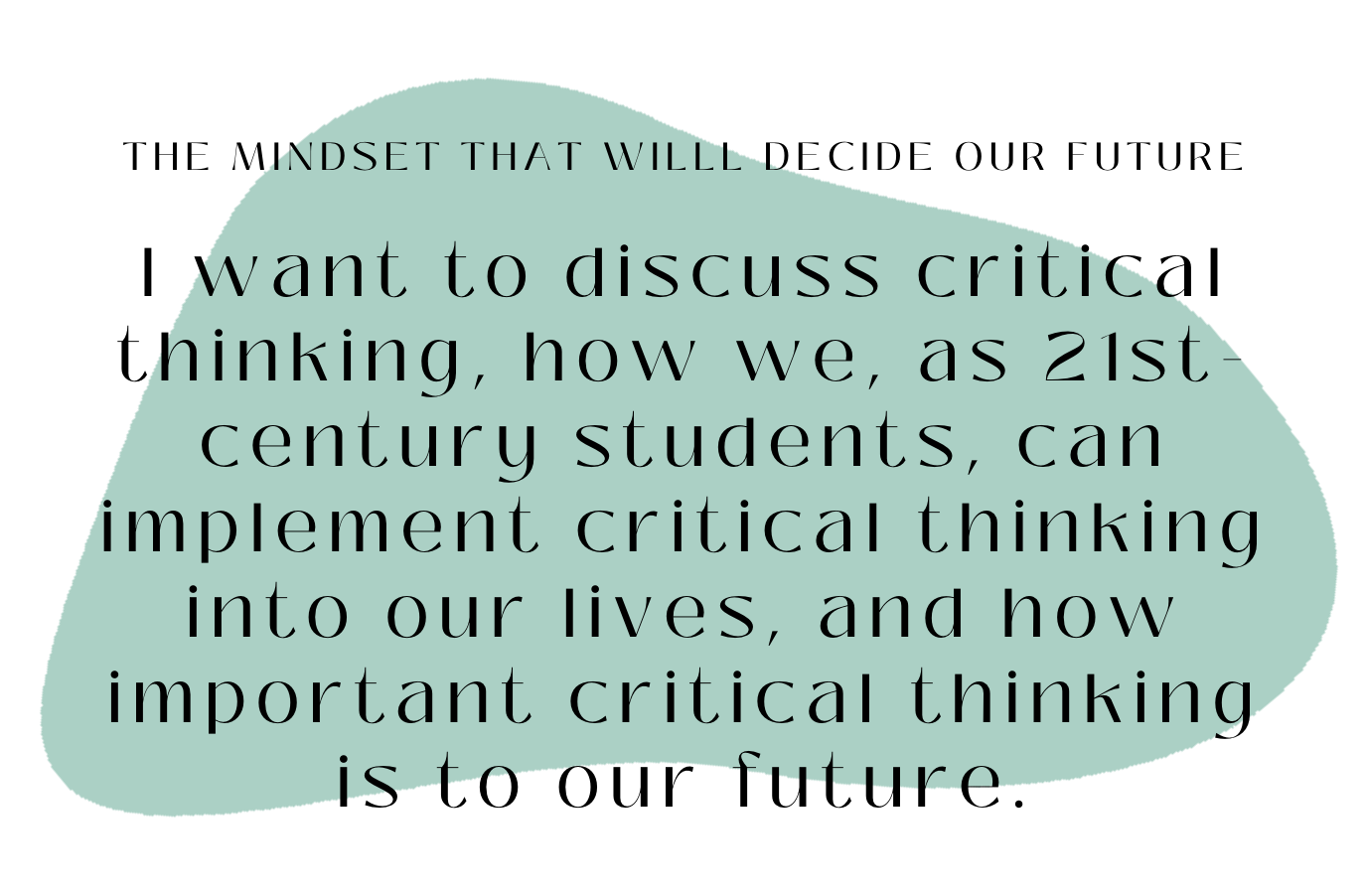 The difference between Tara and us is that most of us have grown up in a community with different sources of information. Whether from the Internet, school textbooks, or friends, we constantly receive different perspectives and beliefs. Such an environment makes our worldview much more complete and comprehensive than Tara's. But in such an environment with so many different sources of information, a mindset of critical thinking is crucial. It allows us to form our judgments and gain a complete understanding of the information and arguments we are exposed to. In this blog post, I would like to discuss critical thinking, how we, as 21st-century students, can implement critical thinking into our lives, and how important critical thinking is to our future.