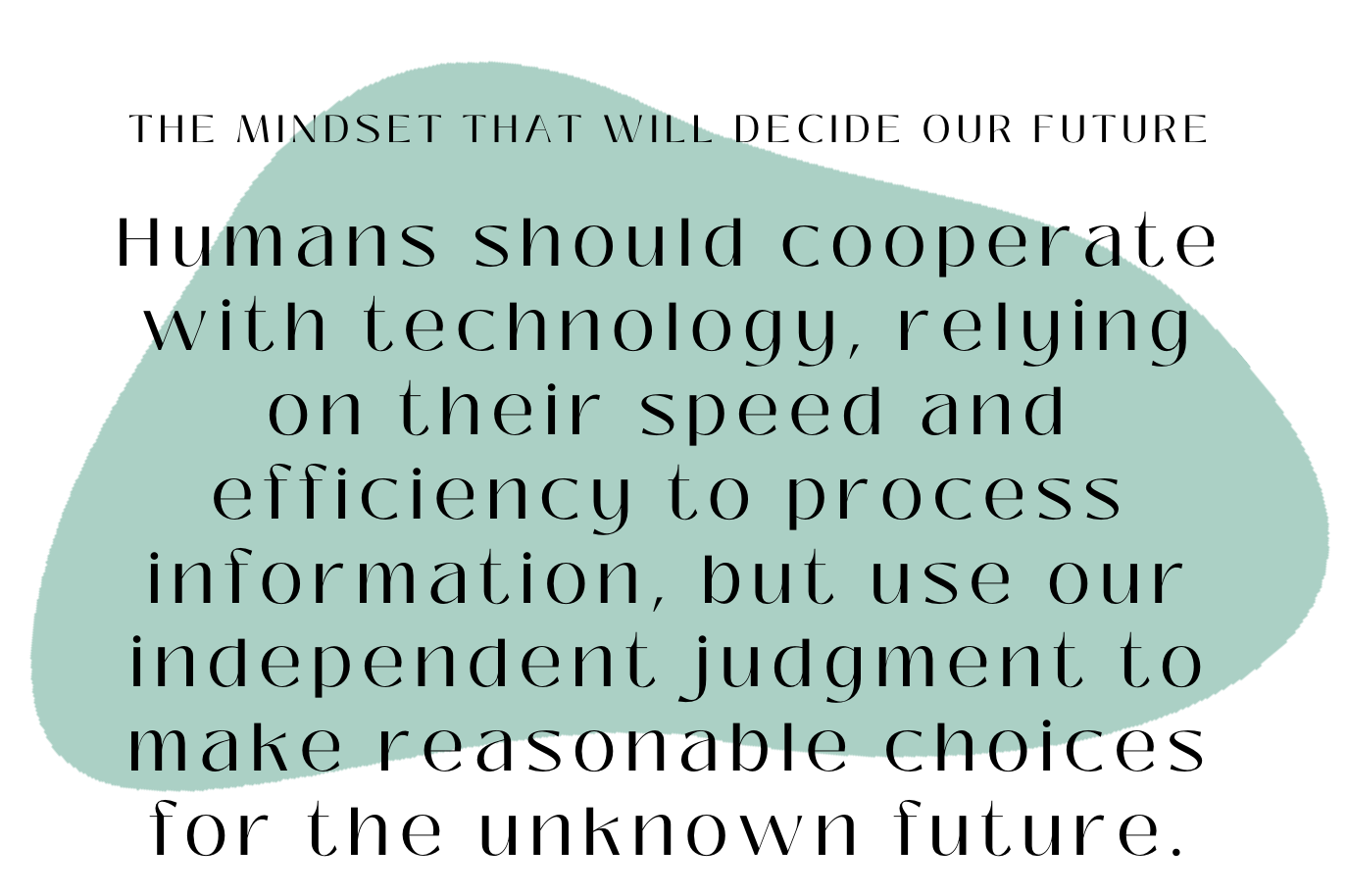 In our future, reliance on technology will be inevitable, and being able to discern the opinions and judgments made by robots can even be the decision that impacts our survival. We cannot choose to follow technology blindly, but to think independently and critically using our humanity. Humans should cooperate with technology, relying on their speed and efficiency to process information, but use our independent judgment to make reasonable choices for the unknown future. We cannot lose control of our future. No matter how big of a role technology will play in our future, we need to be the ones who make the final choice. By exercising the second part of critical thinking, forming our own opinions based on facts can help this generation of students succeed in the future of our society.